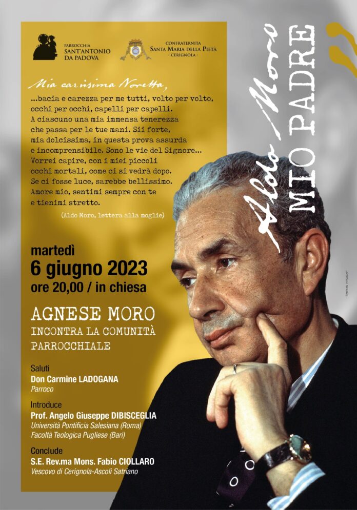 Nell’ambito dei festeggiamenti in onore di Sant’Antonio di Padova, titolare dell’omonima parrocchia a Cerignola guidata da mons. Carmine Ladogana, il 6 giugno 2023, alle ore 20, la comunità incontrerà la dott.ssa Agnese Moro, figlia dello statista Aldo, ucciso dalle Brigate Rosse nel 1978.