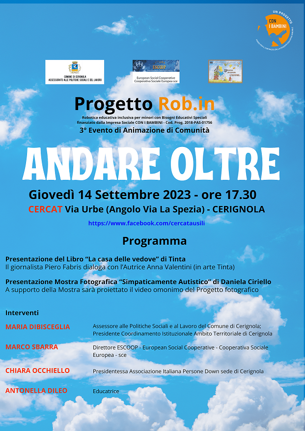 “Andare oltre”. E’ il titolo del terzo evento di animazione di comunità promosso a Cerignola nell’ambito del progetto “Rob.in – Robotica educativa inclusiva per minori con Bisogni Educativi Speciali” – promosso da ESCOOP e selezionato da Con i Bambini nell’ambito del Fondo per il contrasto della povertà educativa minorile. Si tratta di un nuovo incontro finalizzato alla costruzione della comunità educante, che vuole prestare in questa occasione particolare attenzione ai temi sulla disabilità, approfondendo e ragionando sugli strumenti ed i servizi che vanno messi in campo per favorire l’inclusione di bambini e ragazzi con disabilità e una migliore qualità della vita alle loro famiglie. L’evento si svolgerà giovedì 14 settembre 2023 2021, alle ore 17.30, negli spazi del CERCAT in Via Urbe (Angolo Via La Spezia).